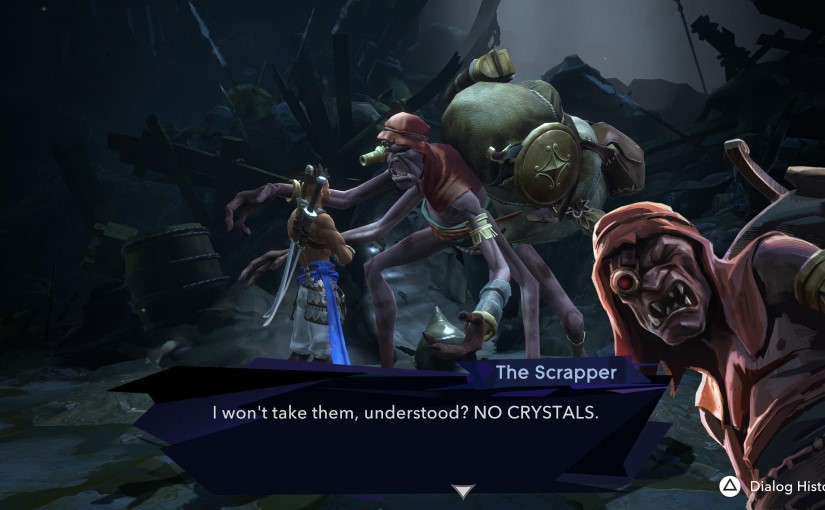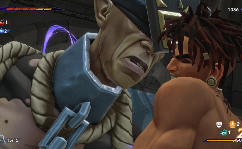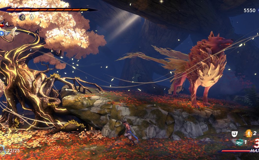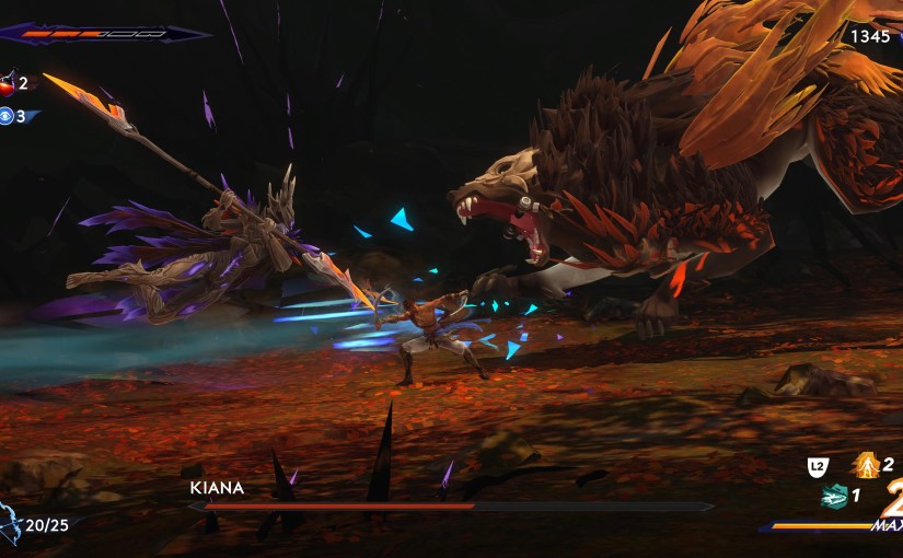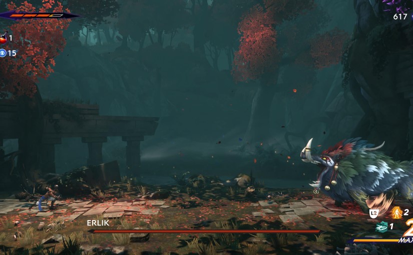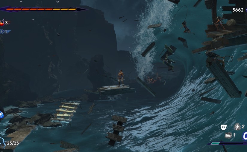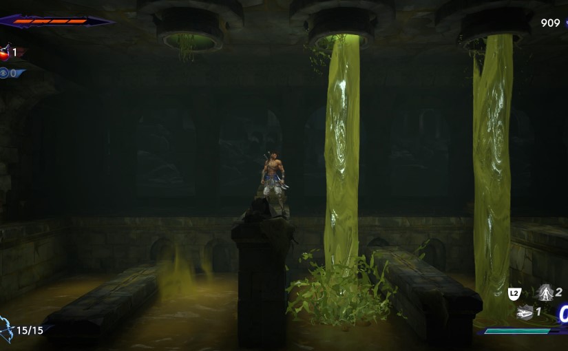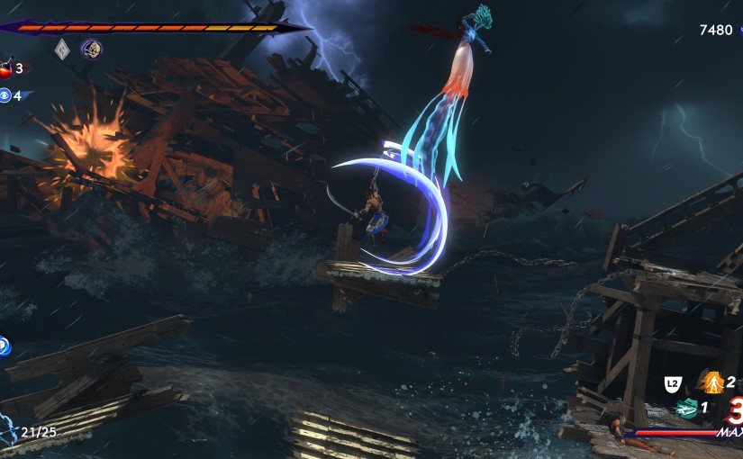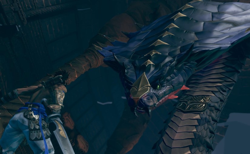 It soon became apparent that Sargon’s trainer, a lady called Anahita, took him, so Sargon is emotionally invested, and we fought some of her minions. I like the combat early on. It flows and feels flashy. A simple combo, dodge, and parry system with special moves similar to many games of this type. The graphics are cool, too. I like the 3D world even though the gameplay is on a strict 2D plane, and the character models are excellent and have a painterly feel. I like it!