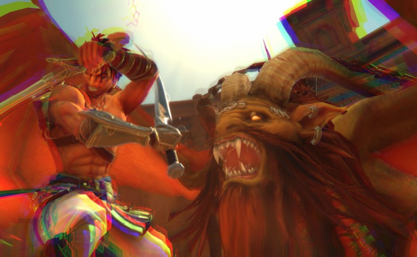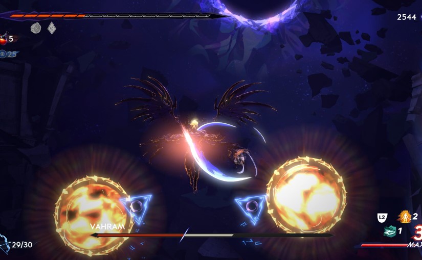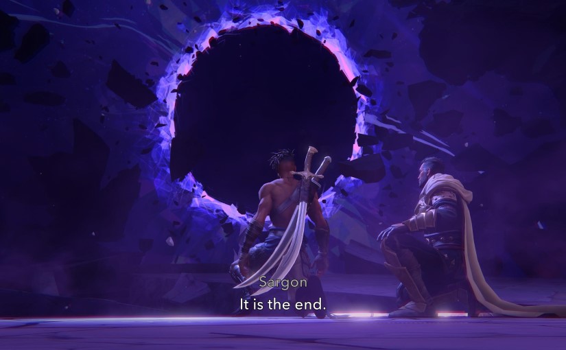 We negotiate one more simple platforming section in a big space/time vortex thing and then it was time to meet with Vahram, god power Tron lines and four angel wings and all. A truly epic fight ensued, and Sargon and I got to his third phase on the first try. The second phase added a giant sword to the mix and the third added a self-cloning ability for big V.