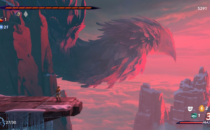 Continuing on we found another external area with quite the view. There was a gigantic, and I mean gigantic, wing in the background, apparently made of rock. Following this area took us to the very top of the elevator mentioned earlier on the other side of a trap door that couldn’t be opened from below. There was a stretch where Sargon had to fight off a flock of harpies and some of Anahita’s guards and we got killed here a lot. I really think I’m still suffering from the Shinobi muscle memory, as I tend to jump into battle with multiple enemies expecting to be able to outmanoeuvre them, hit and run, and get away scot free, but Sargon can’t do that, and we ended up surviving this stretch easily by moving forward more cautiously and taking on enemies one or two at a time. That’s the key I think.