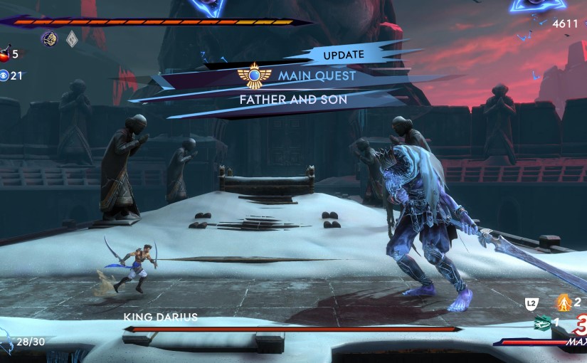 A cutscene ensued explaining that Vahram is King Darius’ son and the rightful heir, and that Darius was killed by the current Queen. She’s the usurper! That’s why the Simurgh has gone and Persia has had 30 years of drought. However, Vahram has taken things way too far, so he’s still a bad guy too. It’s not over, as he’s still at large and wants all the power. Anahita drifts away in golden light and the two Sargons merge and Sargon gets the grapple ability using his sash (that the Queen gave him). Prince Ghassan is just stood there all like “what just happened?” He says we need to go to the Tower of Silence next to get a key. We’ve been there before. It’s very chilly.