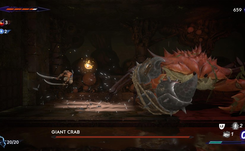 The next area after this was an enormous archive of knowledge inhabited with mad alchemists, and the boss stalks the area. He seems to be a blind fellow capable of one-hit kills and there are sections where Sargon must avoid his hearing radius or risk being smushed by the boss’ big, horrible stick. This reminded me of the E.M.M.I. areas in Metroid Dread. I decided to quit at this point, but not because I was scared, okay? The wife had come home from work and it was time to get some food. Priorities, you know.